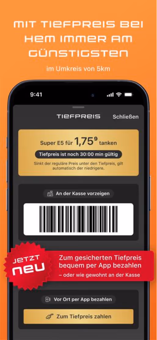Mit der Tiefpreisgarantie in der HEM App sicherst du dir immer den besten Benzinpreis - ganz ohne aufwändige Vergleiche. Du erhältst einen Coupon für den besten Preis im Umkreis von 5 km deiner HEM Tankstelle direkt in der App. Gültig für die Kraftstoffe Super E5, Super E10 und Diesel.