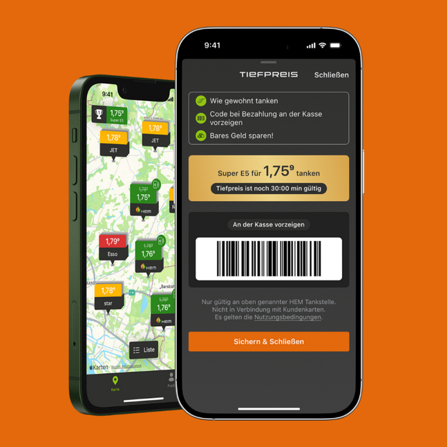 Mit der Tiefpreisgarantie* in der HEM App** sicherst du dir immer den besten Spritpreis - ganz ohne aufwändige Vergleiche. Du erhältst einen Coupon für den besten Preis im Umkreis von 5 km deiner HEM Tankstelle direkt in der App. Gültig für die Kraftstoffe Super E5, Super E10 und Diesel.
